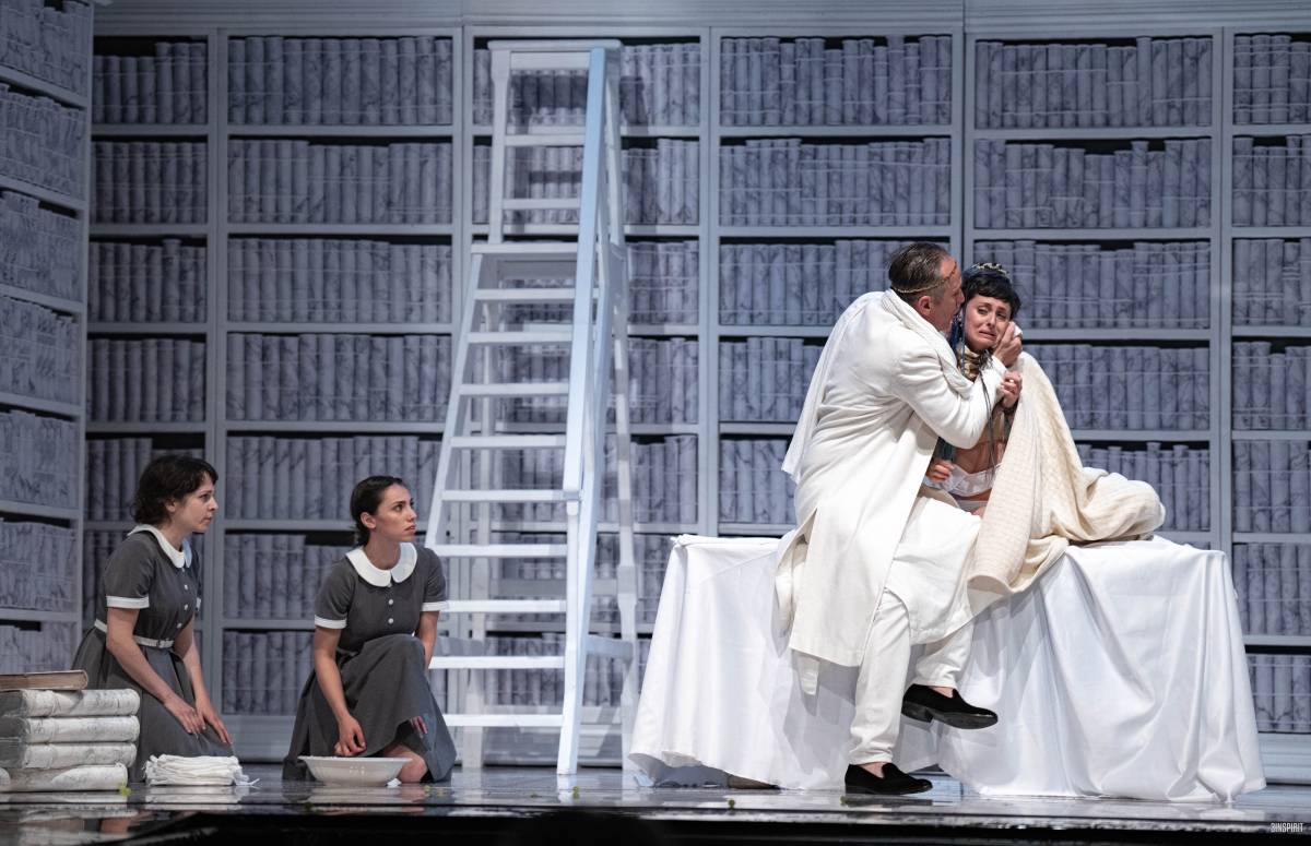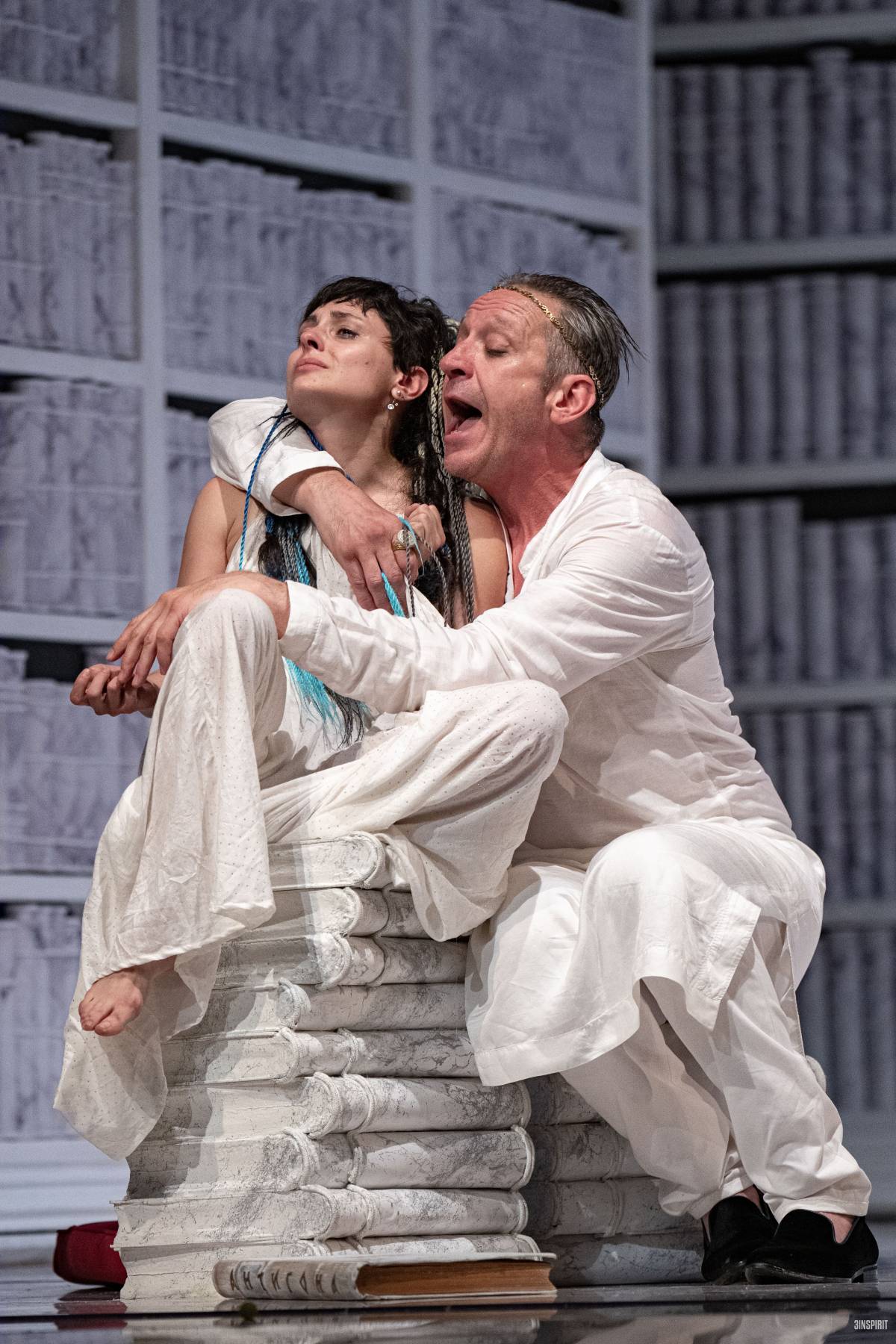 Антигона на Милена Ерменкова завладява със силата на духа, със заложения в нея морален камертон. Тя е такава, каквато е и нищо не може да я отклони от предначертания път. Не може да не се погребват мъртвите, не може да не се зачитат близките и да се отменя постигнатото във вековете. Действието се развива сред голяма библиотека (сценографията е на Семьон Пастух и Тита Димова-Вантек) и само на Антигона е дадено правото да се възкачи на върха й, защото тя и поетични натури като нея познават действената сила на думите и са способни на дела в мигове на политически и социални изпитания.